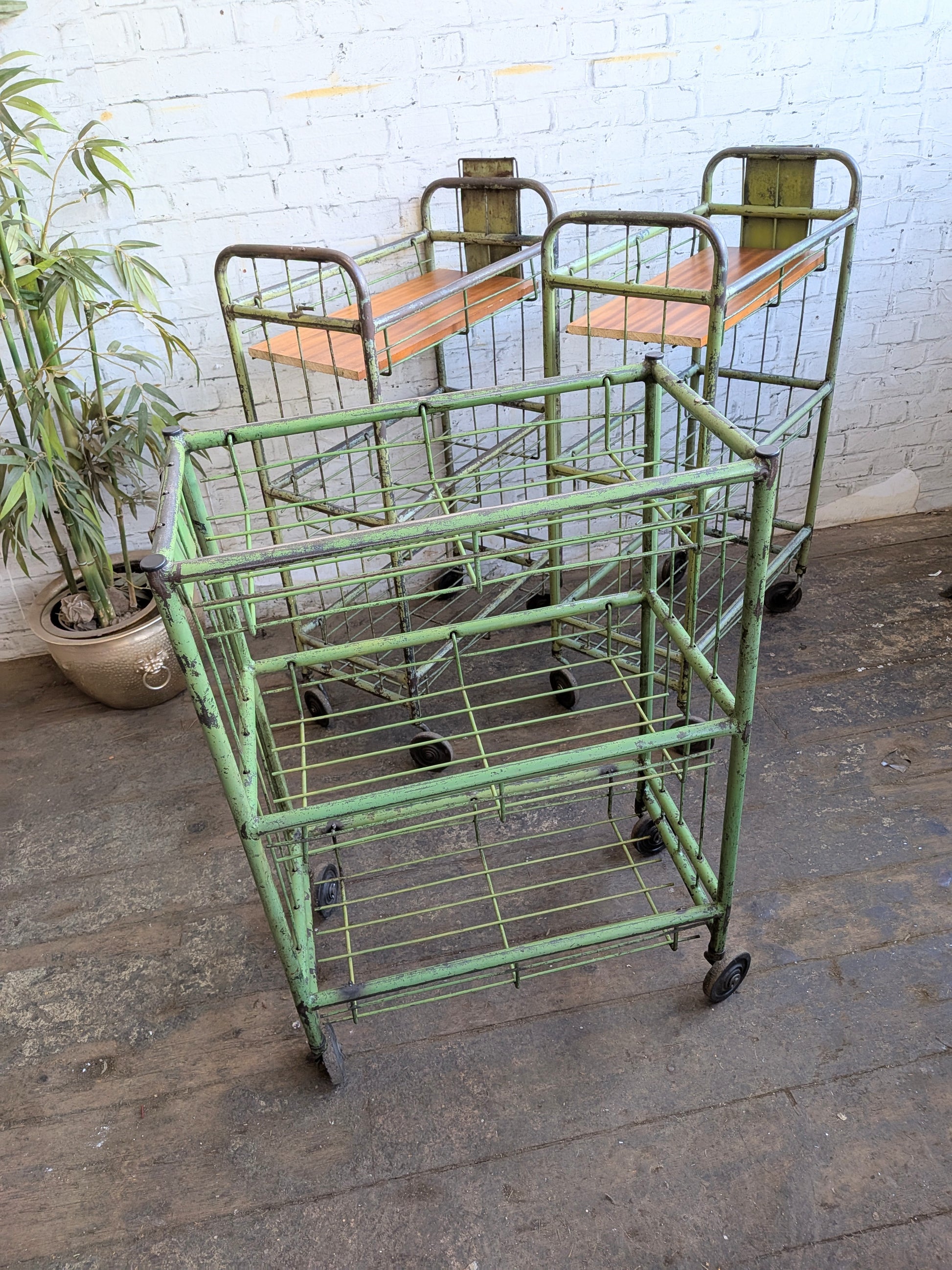 - 1 x vintage mid century industrial storage trolley. The trolley originally came from a textile mill but has been used in a metal fabrications factory for the past 20 or 30 years.