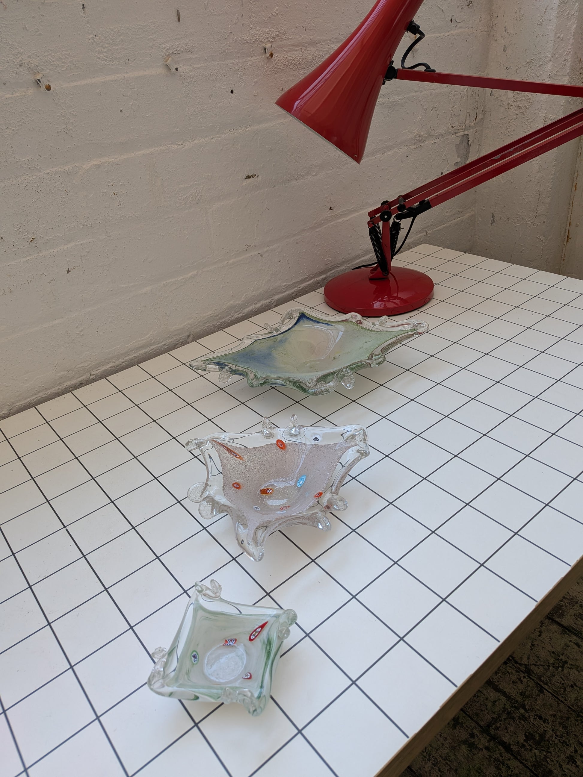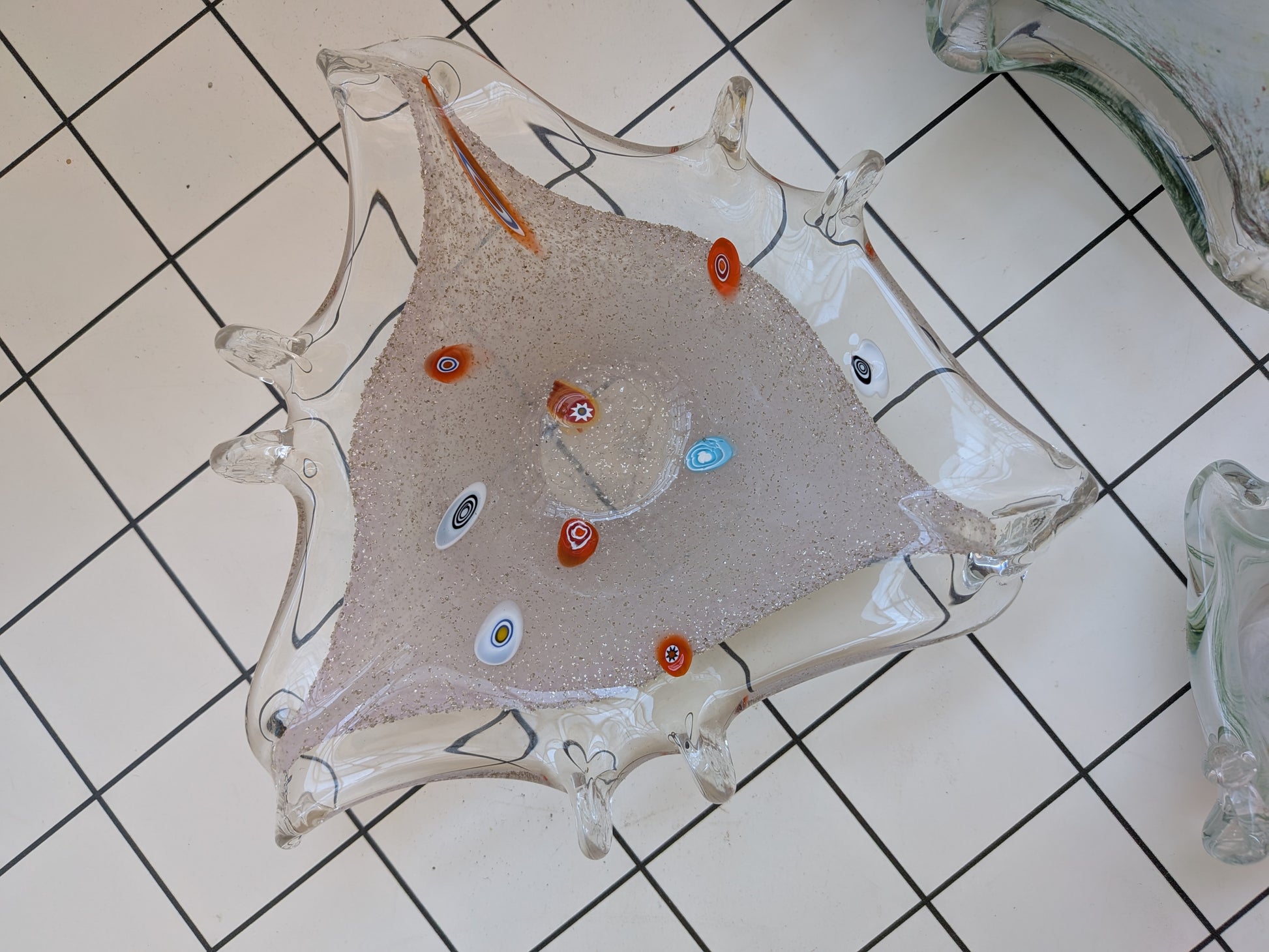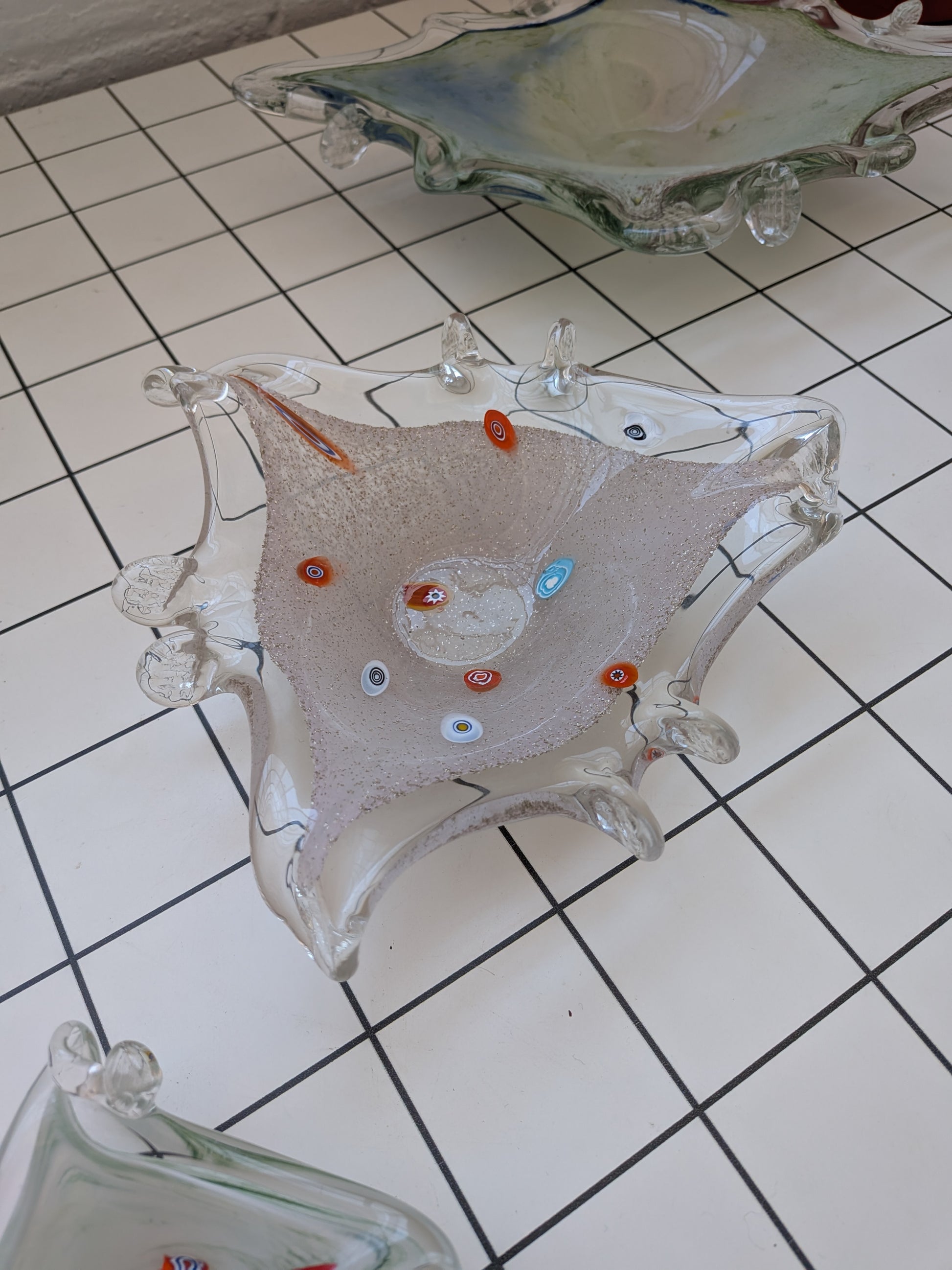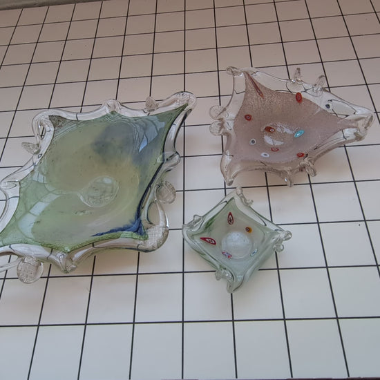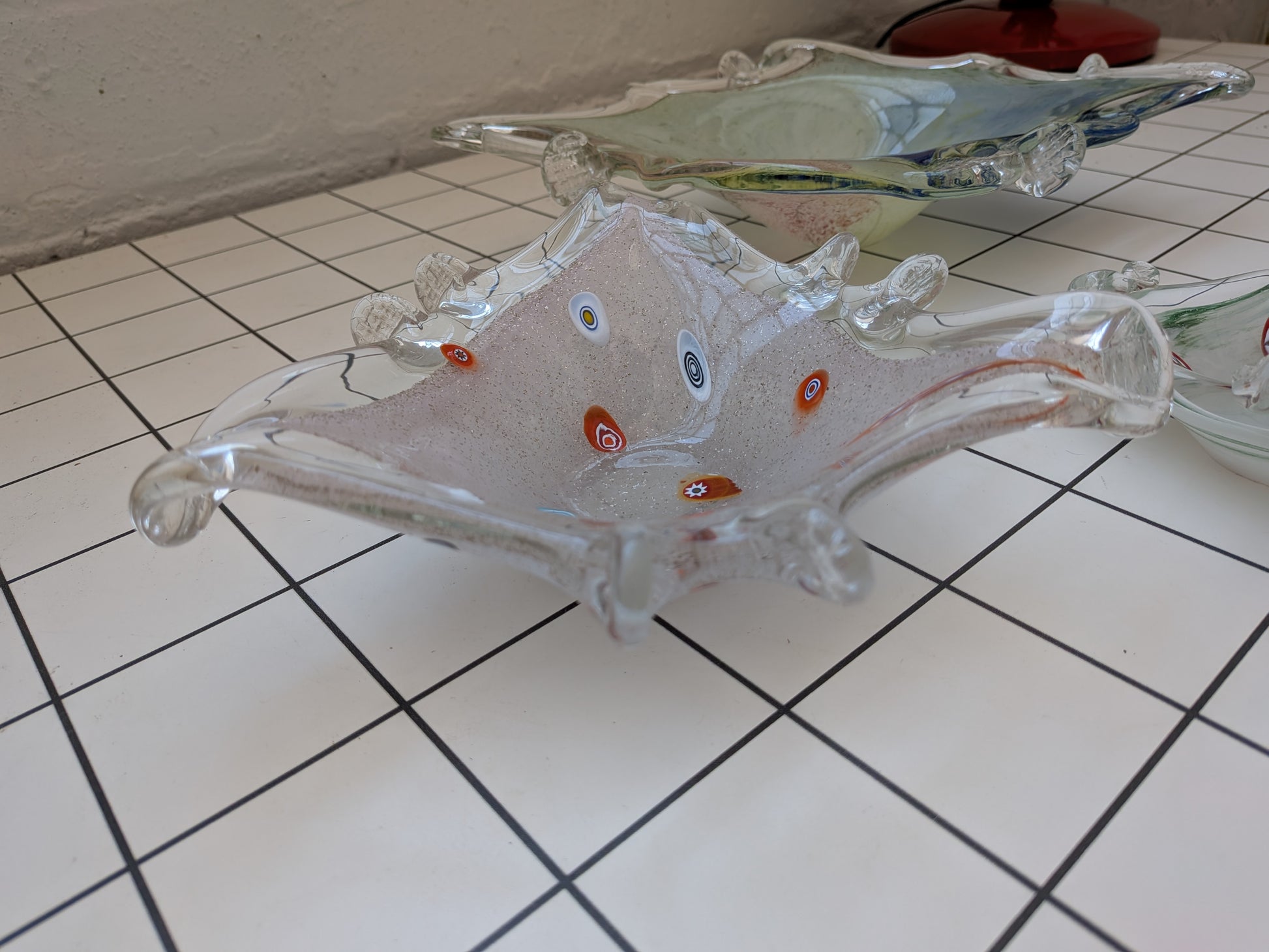 - 2 of the dishes have applied Millefiori style designs and the larger Lavorazione style dish has opaque colours.