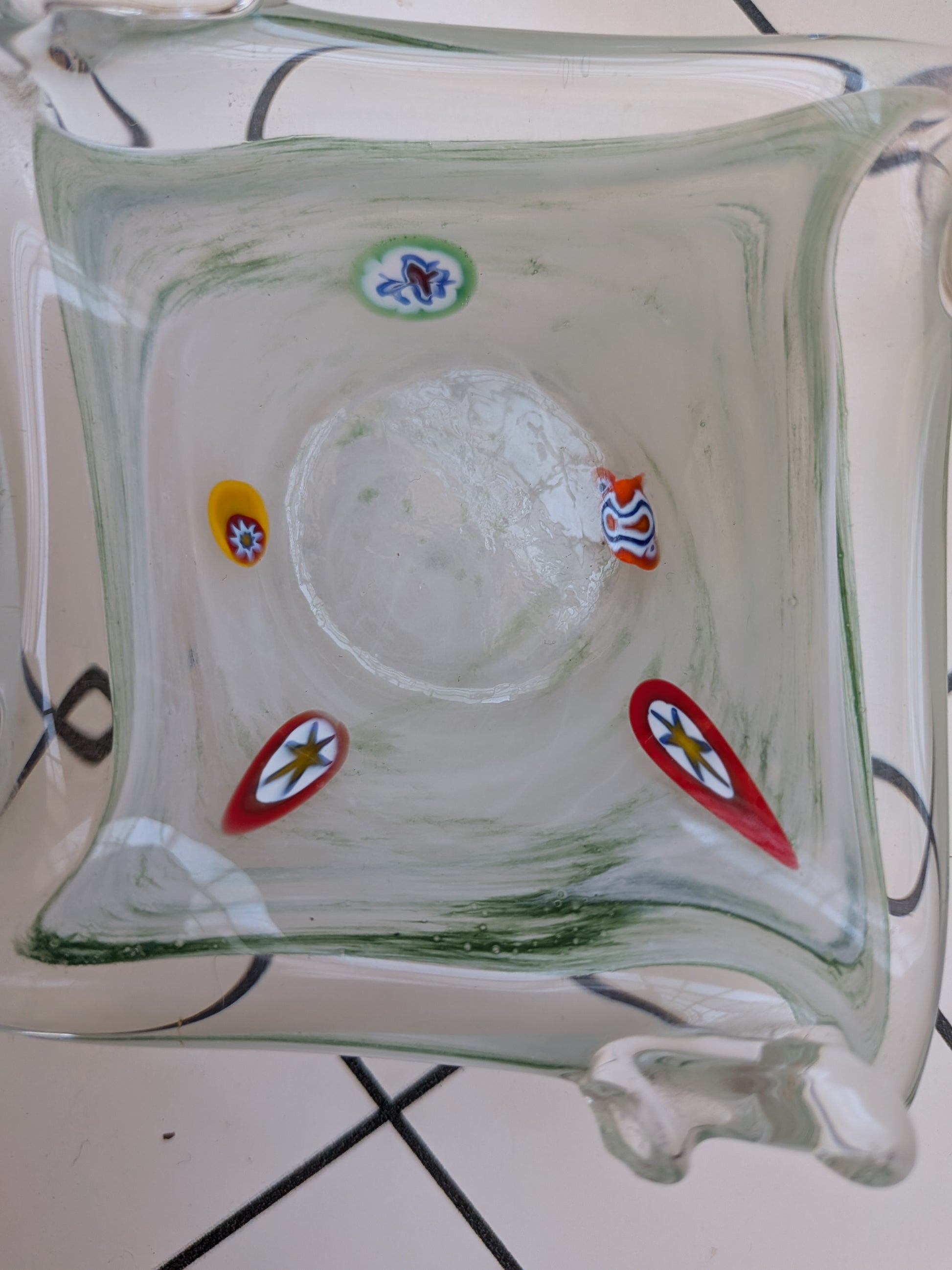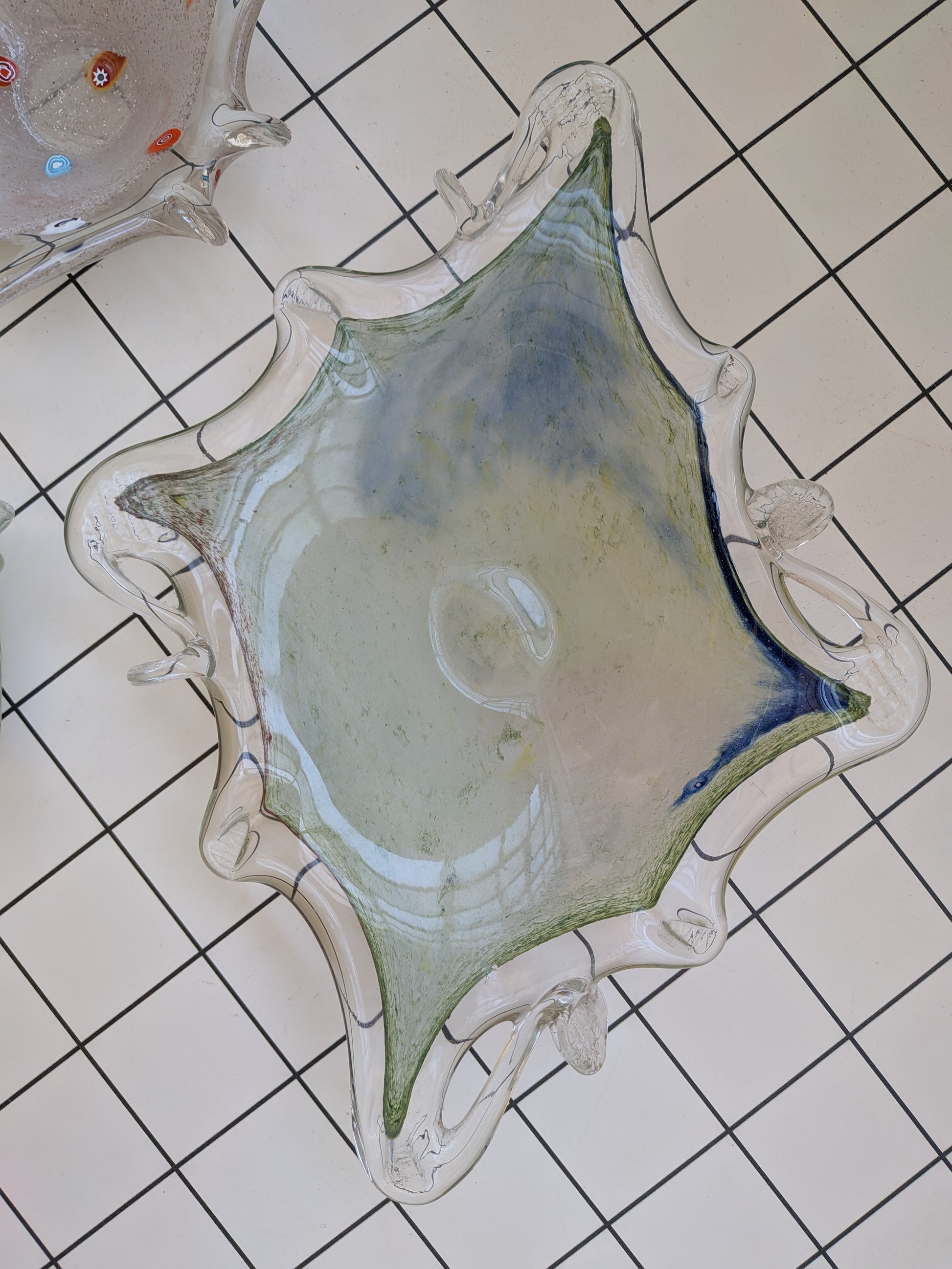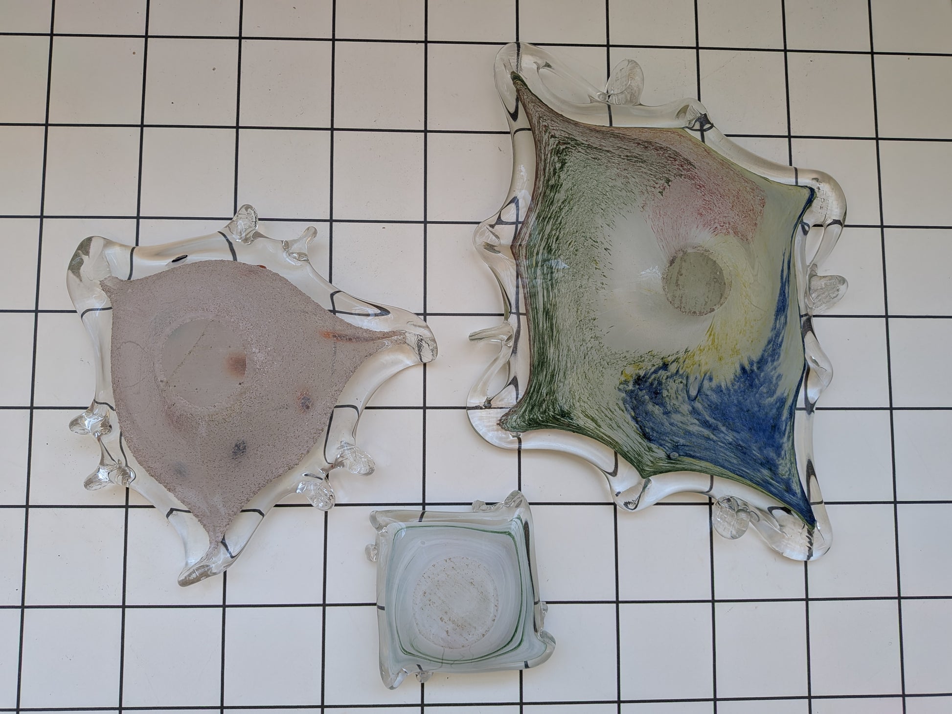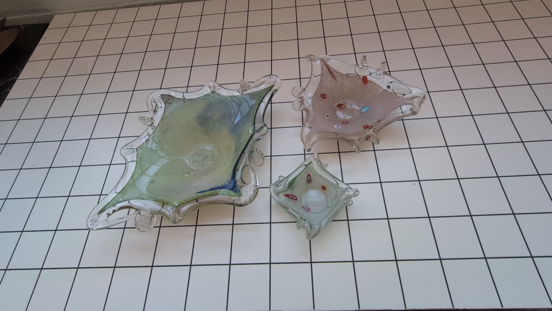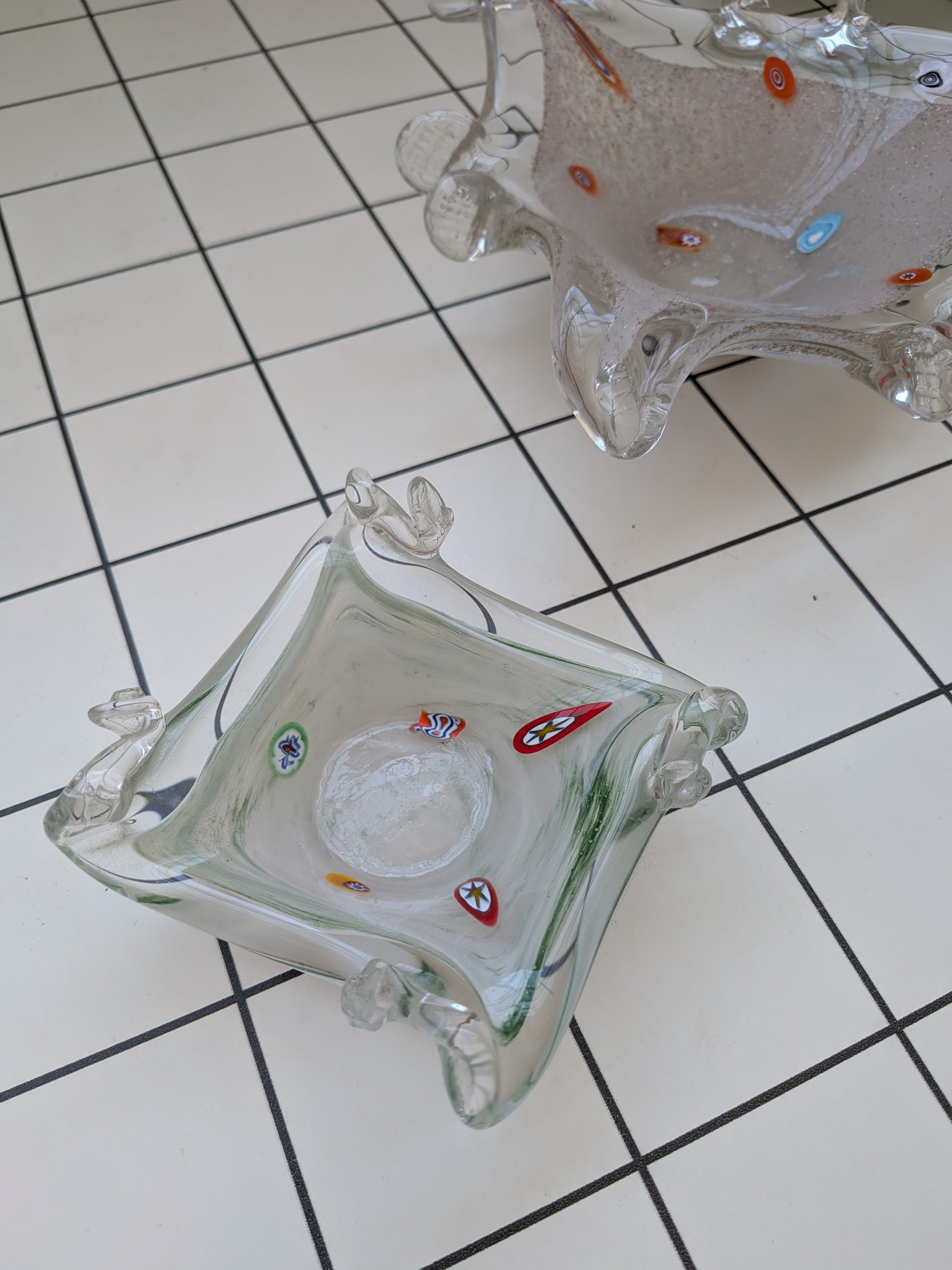 - 2 of the dishes have applied Millefiori style designs and the larger Lavorazione style dish has opaque colours.