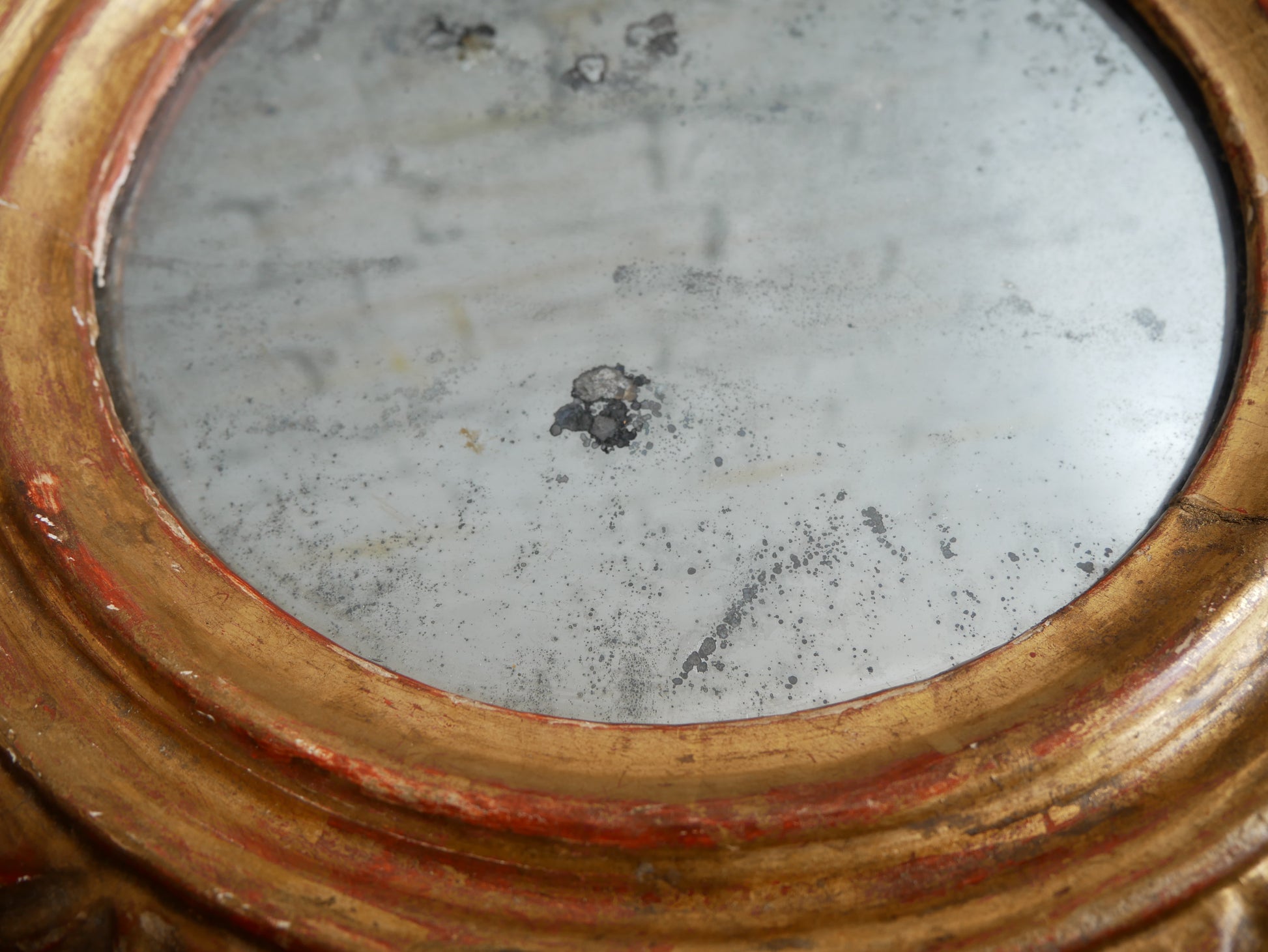 - Beautifully worn gilt frame encasing a distressed mercury or tin backed mirror.