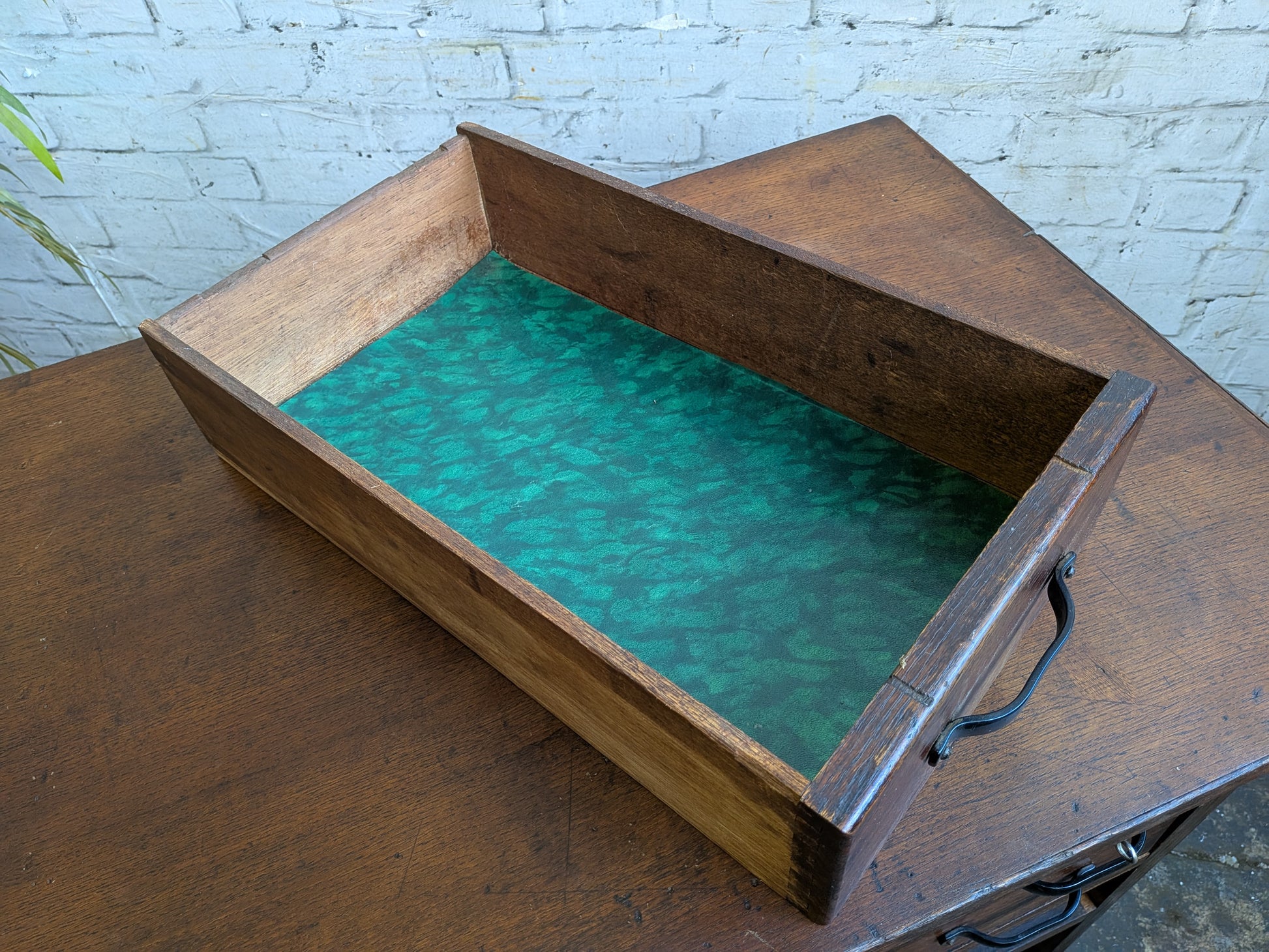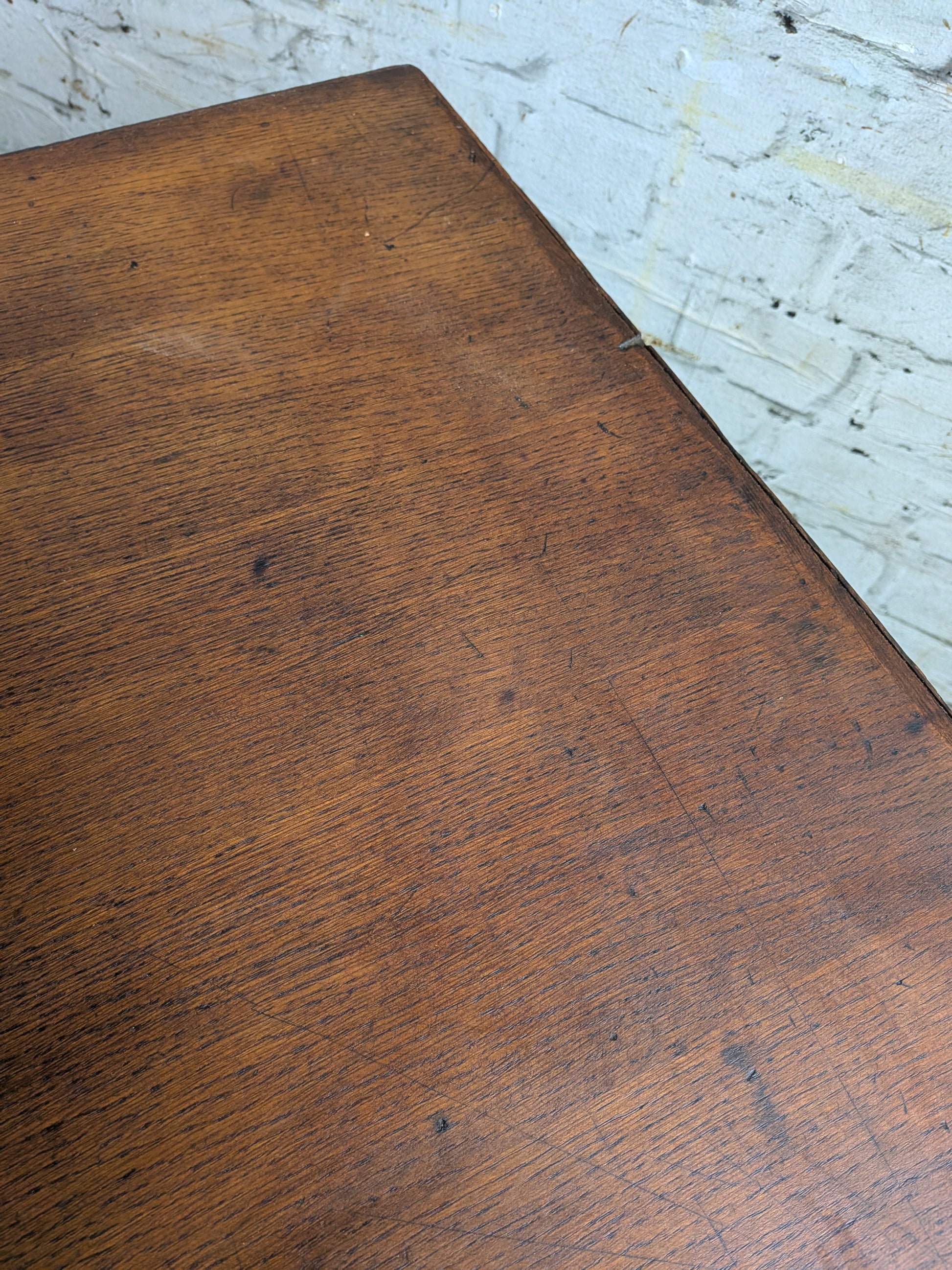 - Condition: great vintage condition with expected age/ use wear and tear including having marks to it's top. The drawers have been given new paper linings and the whole desk has been cleaned, waxed, and polished.