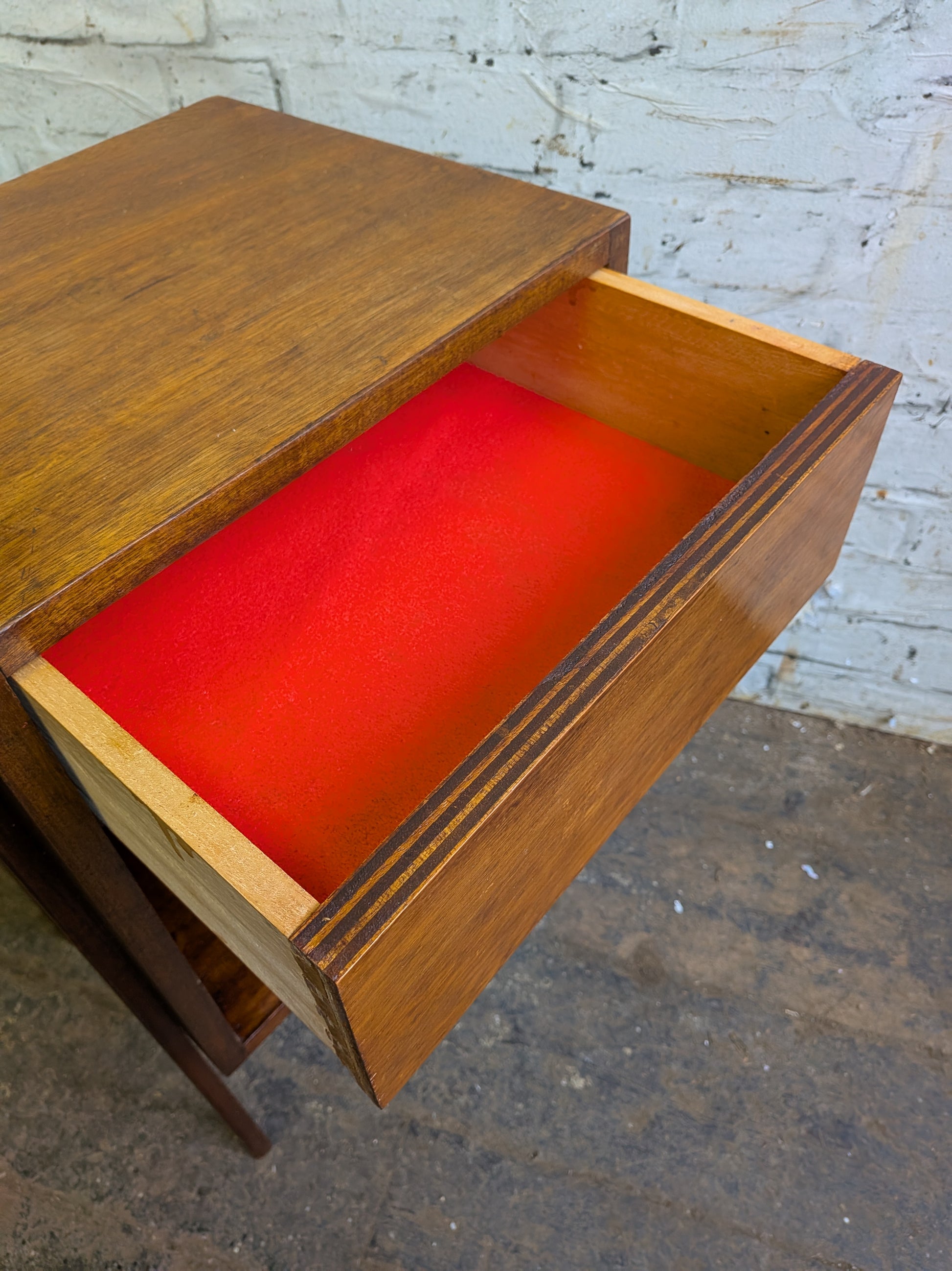 - Single drawer with new red felt lining.