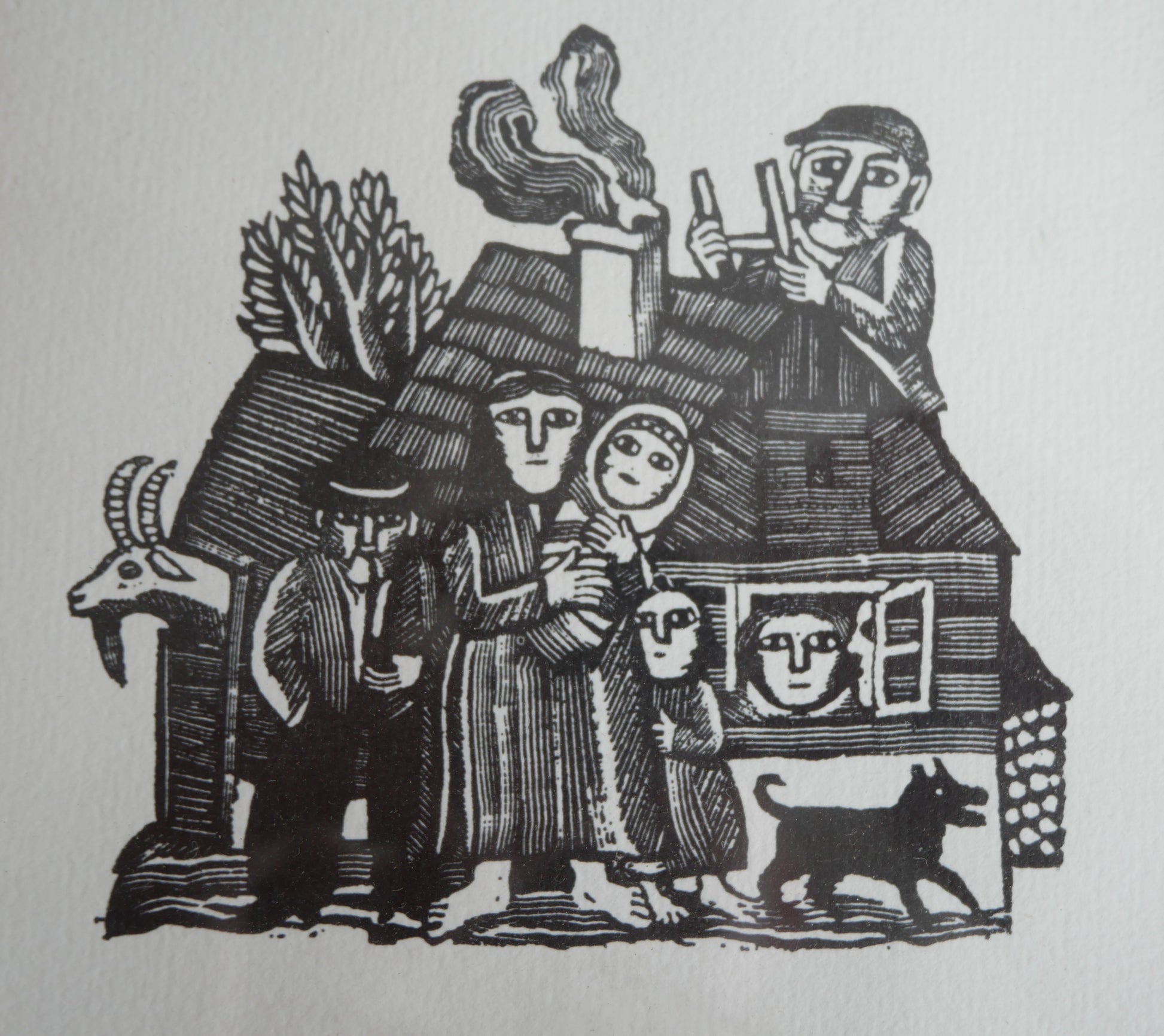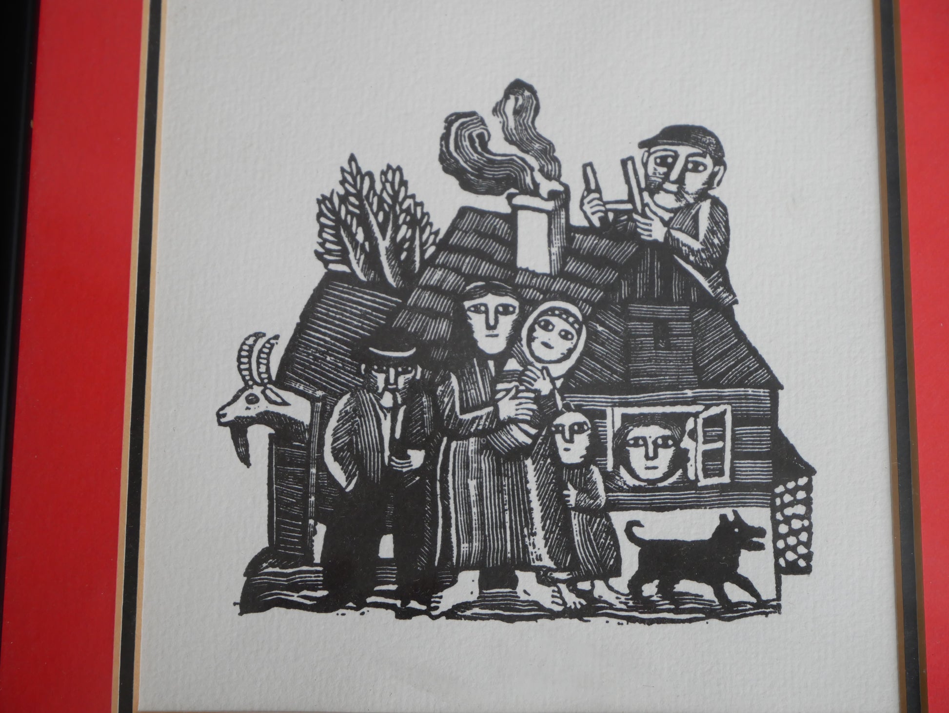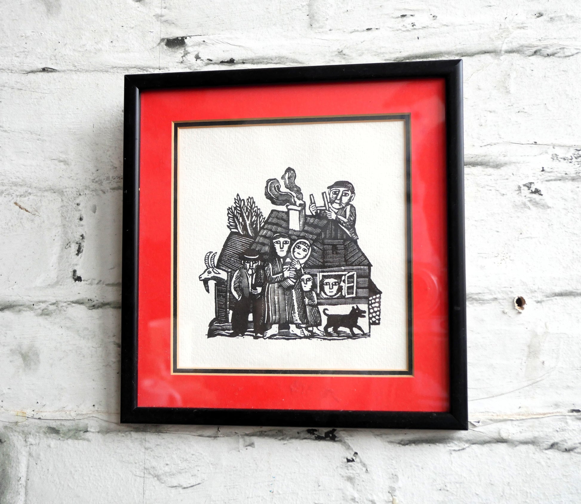 Unusual Small Vintage Wood Block Engraving Framed Art Print in the Style of Ilya Schor