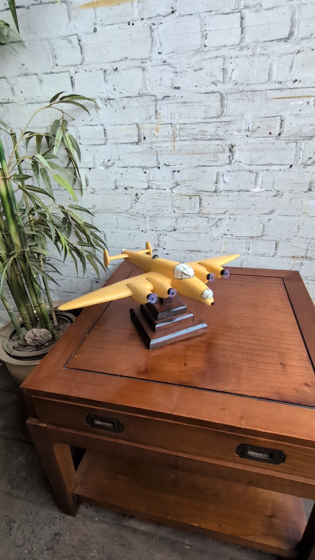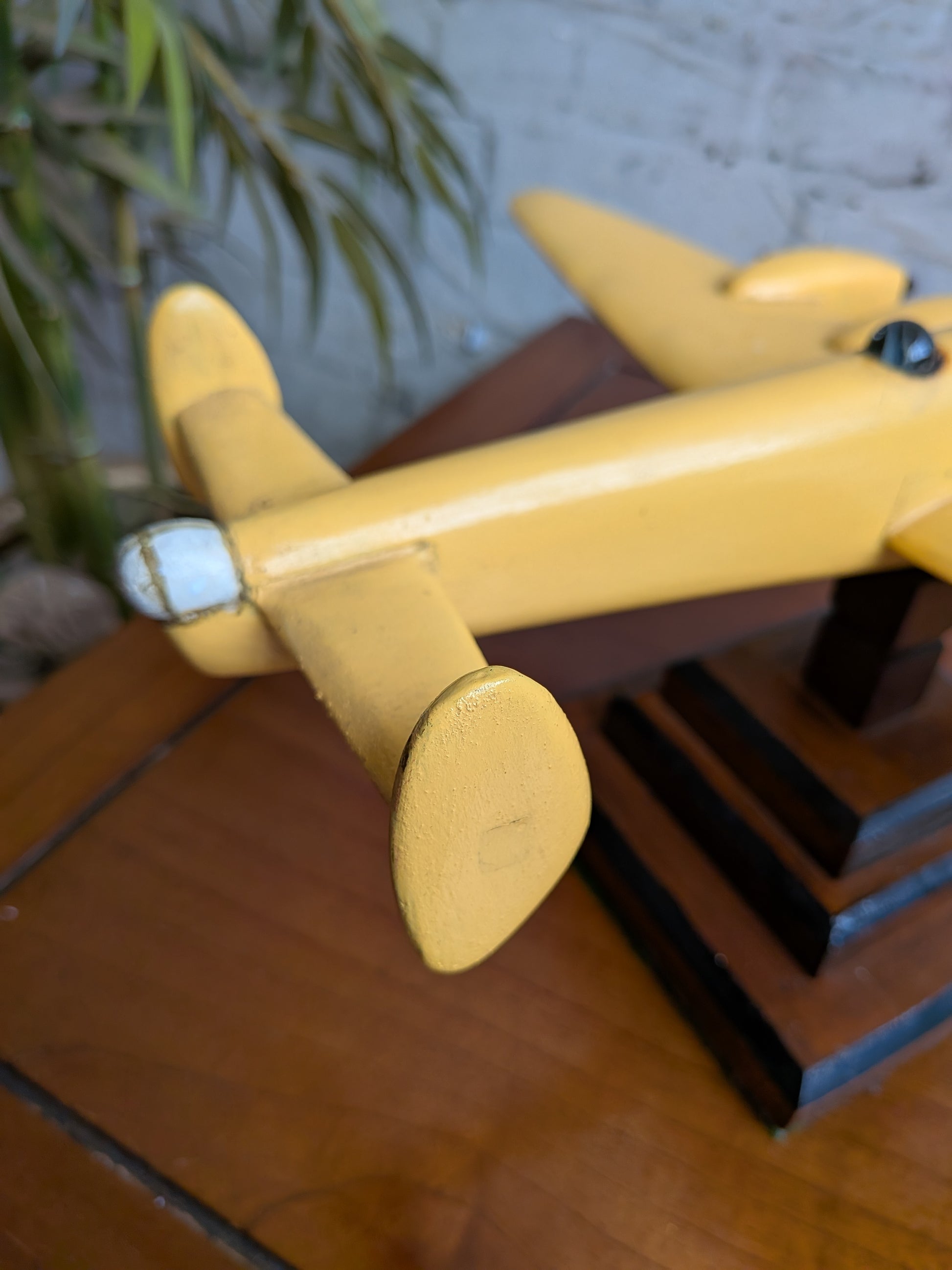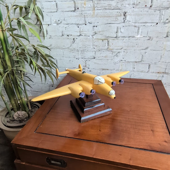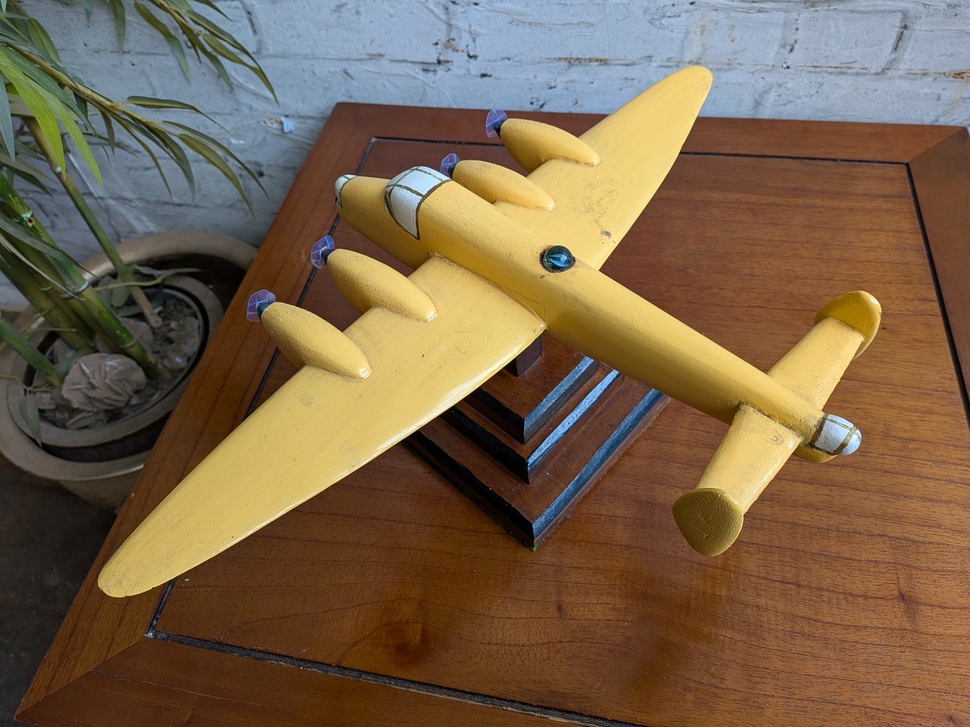 Vintage 50s 60s Folk Art Hand Painted Wooden Lancaster Bomber Toy Model on Art Deco Base