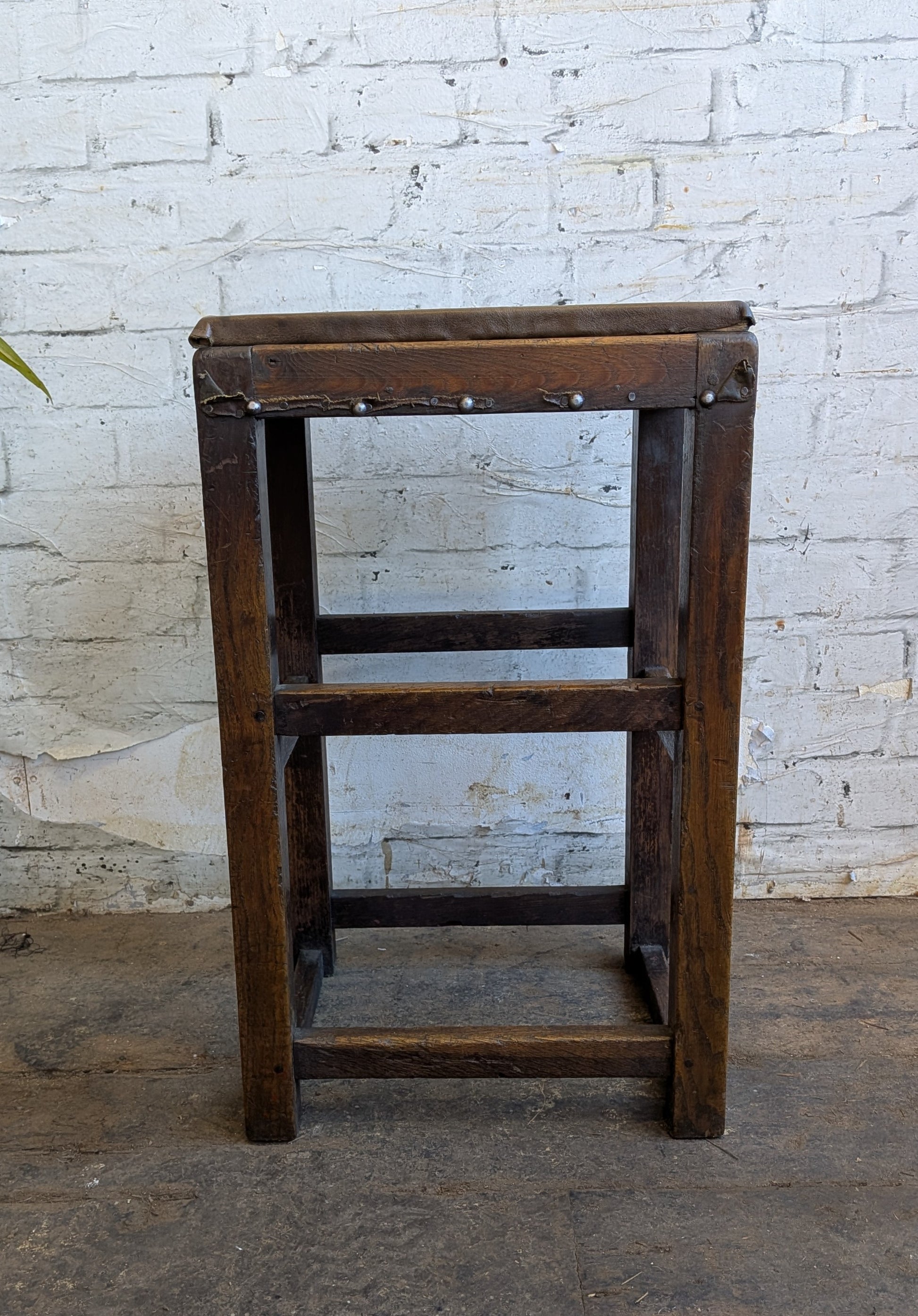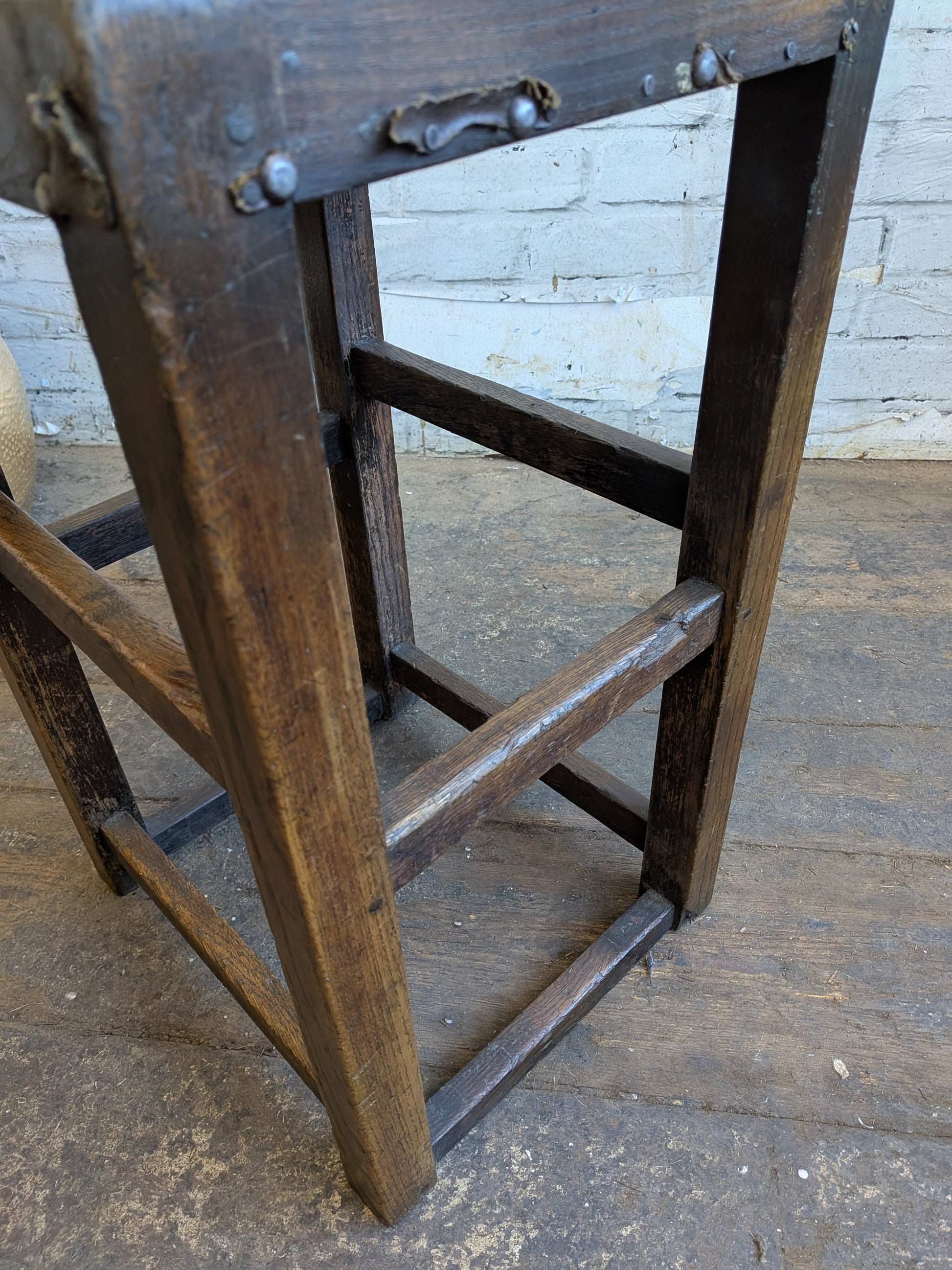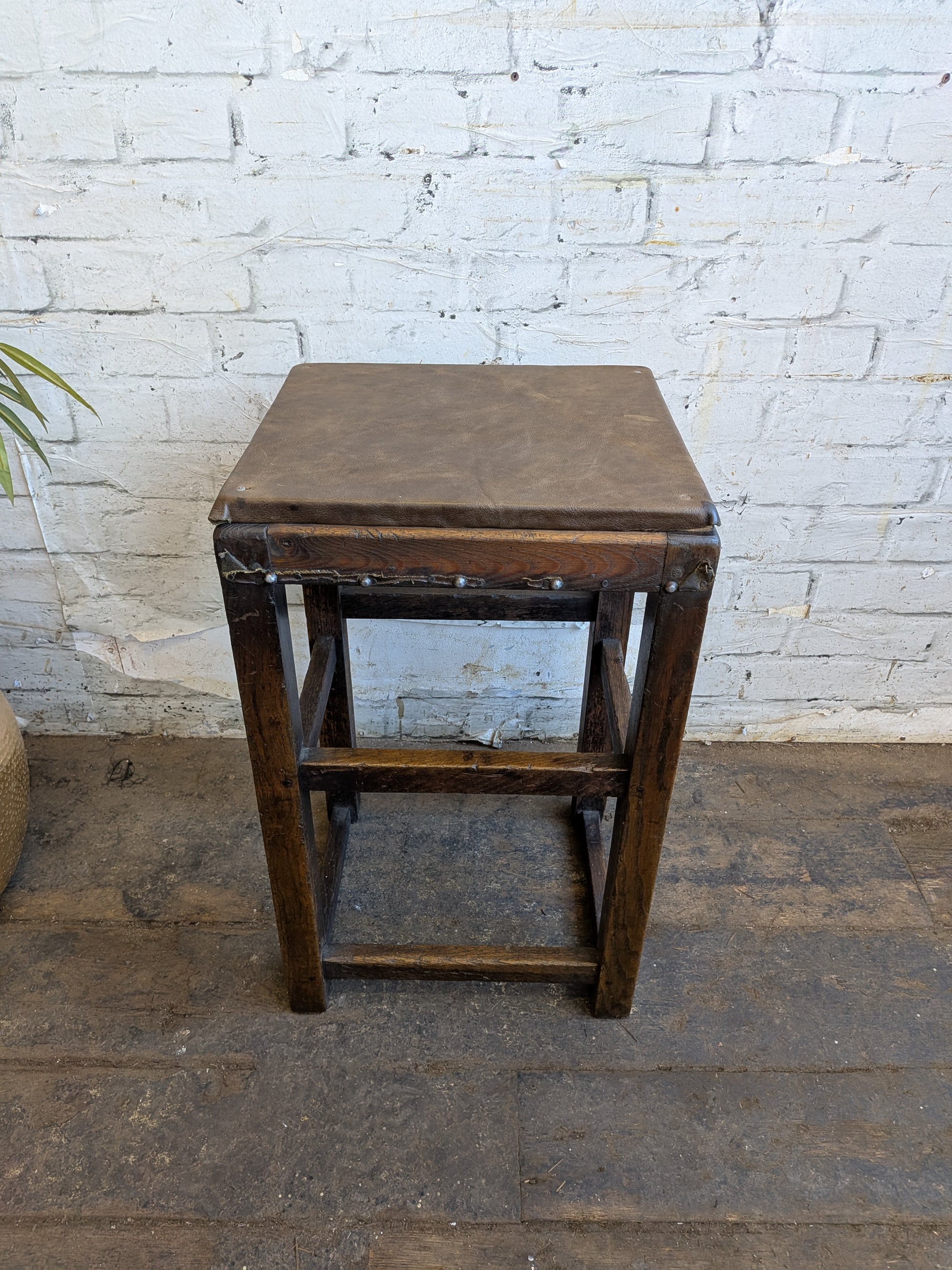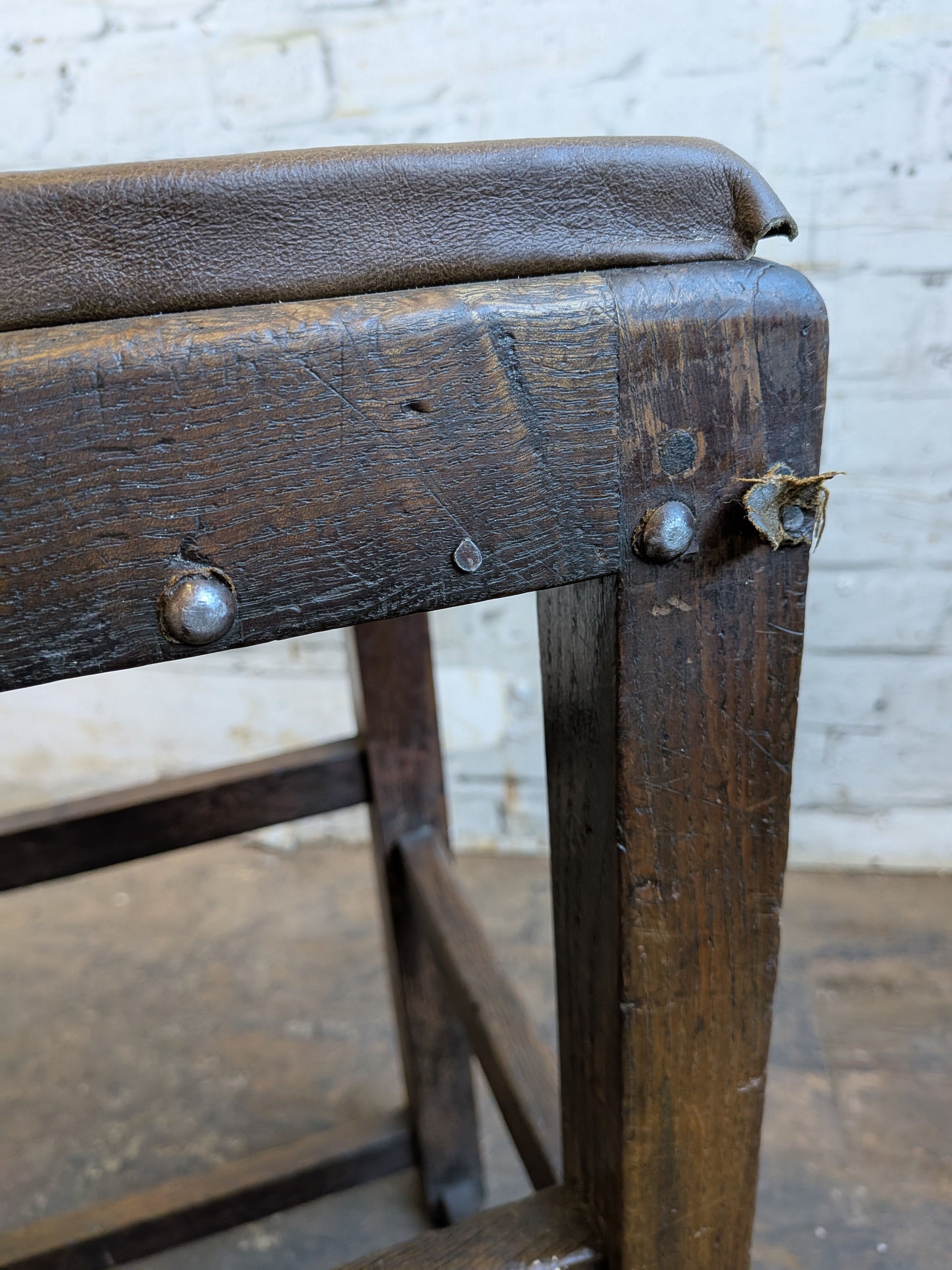 Vintage Oak Folk Art Industrial Factory Machinists Work Lab Stool With Leather Seat