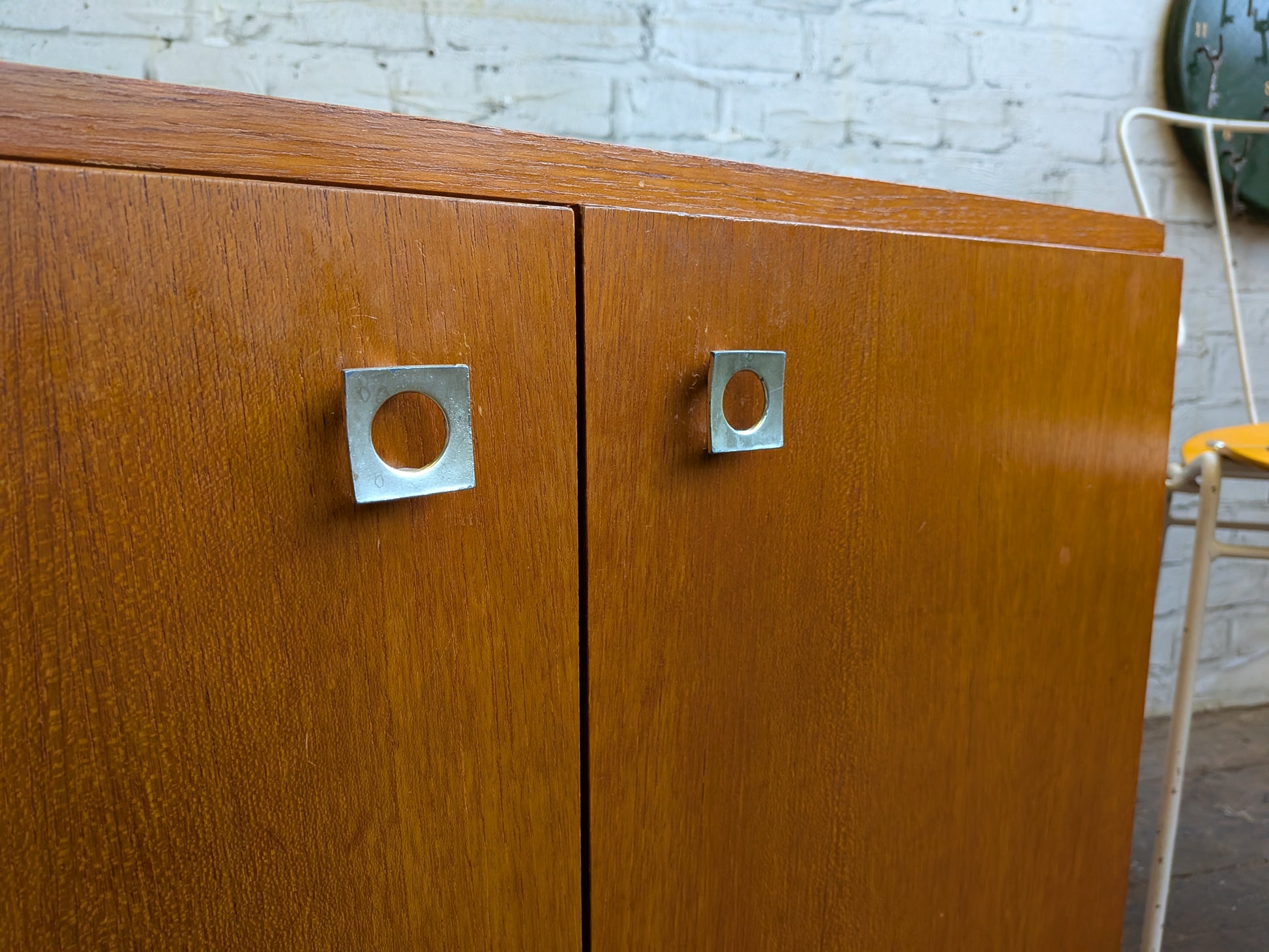 - 2 doors will square metal handles.